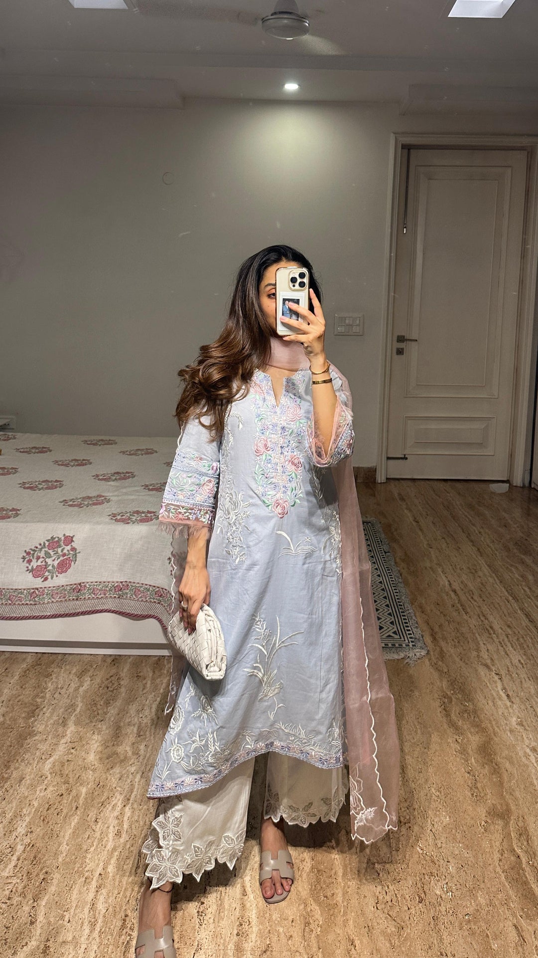 Paired with modal satin pants in a deeper teal hue, the set brings a touch of structured contrast to the fluidity of the kaftan. Whether you’re dressing for a festive brunch, a mehendi afternoon, or an elegant day soirée, this ensemble is designed to make you feel light, graceful, and radiant.