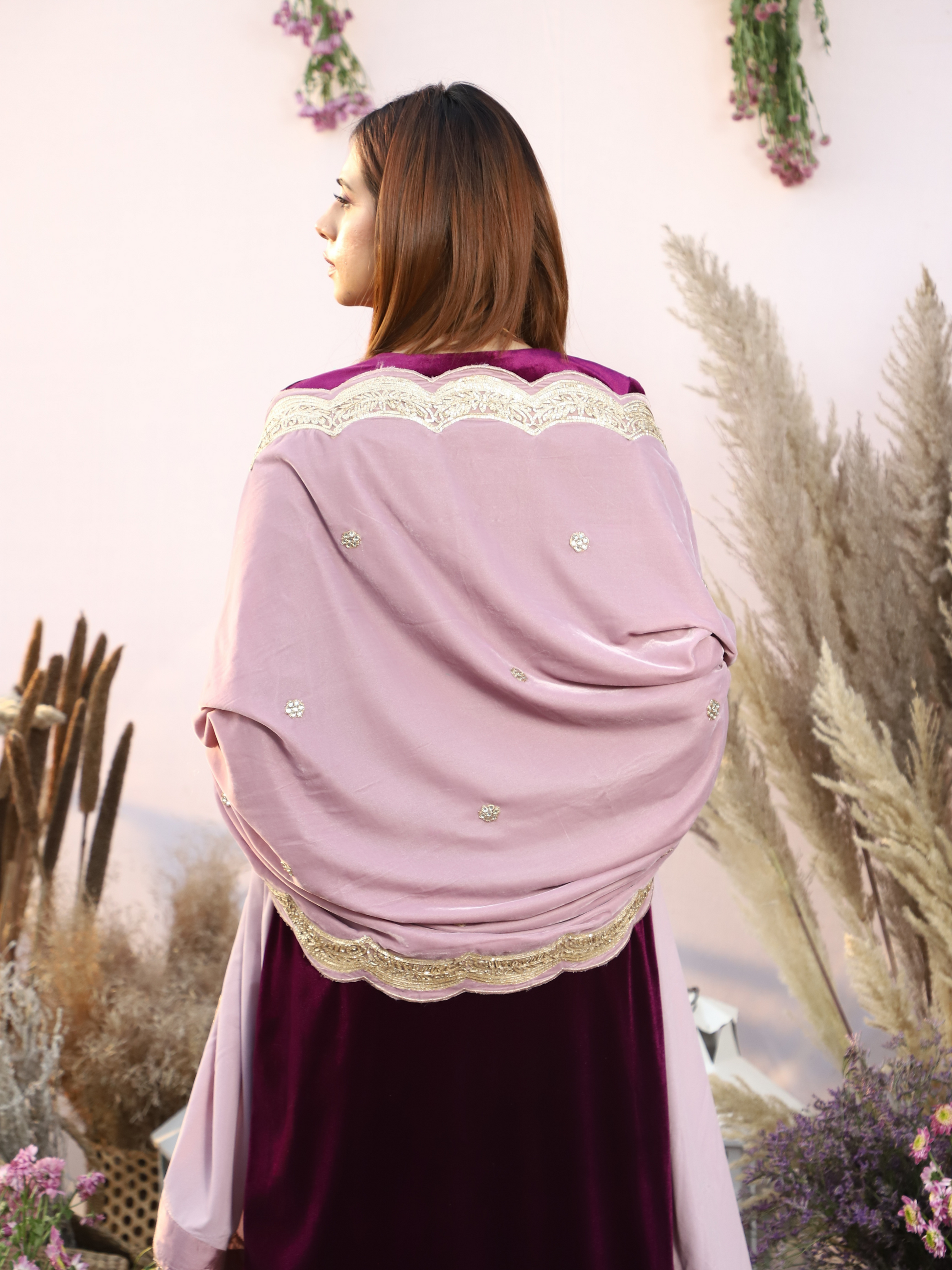 Plum hand-embroidered silk velvet kurta with sleeve and pocket detailing. Plum silk velvet hand embroidered palazzo. Complete your look with Embroidered Velvet Dupatta adorned with Scallop edges or Sheer Organza Dupatta.
