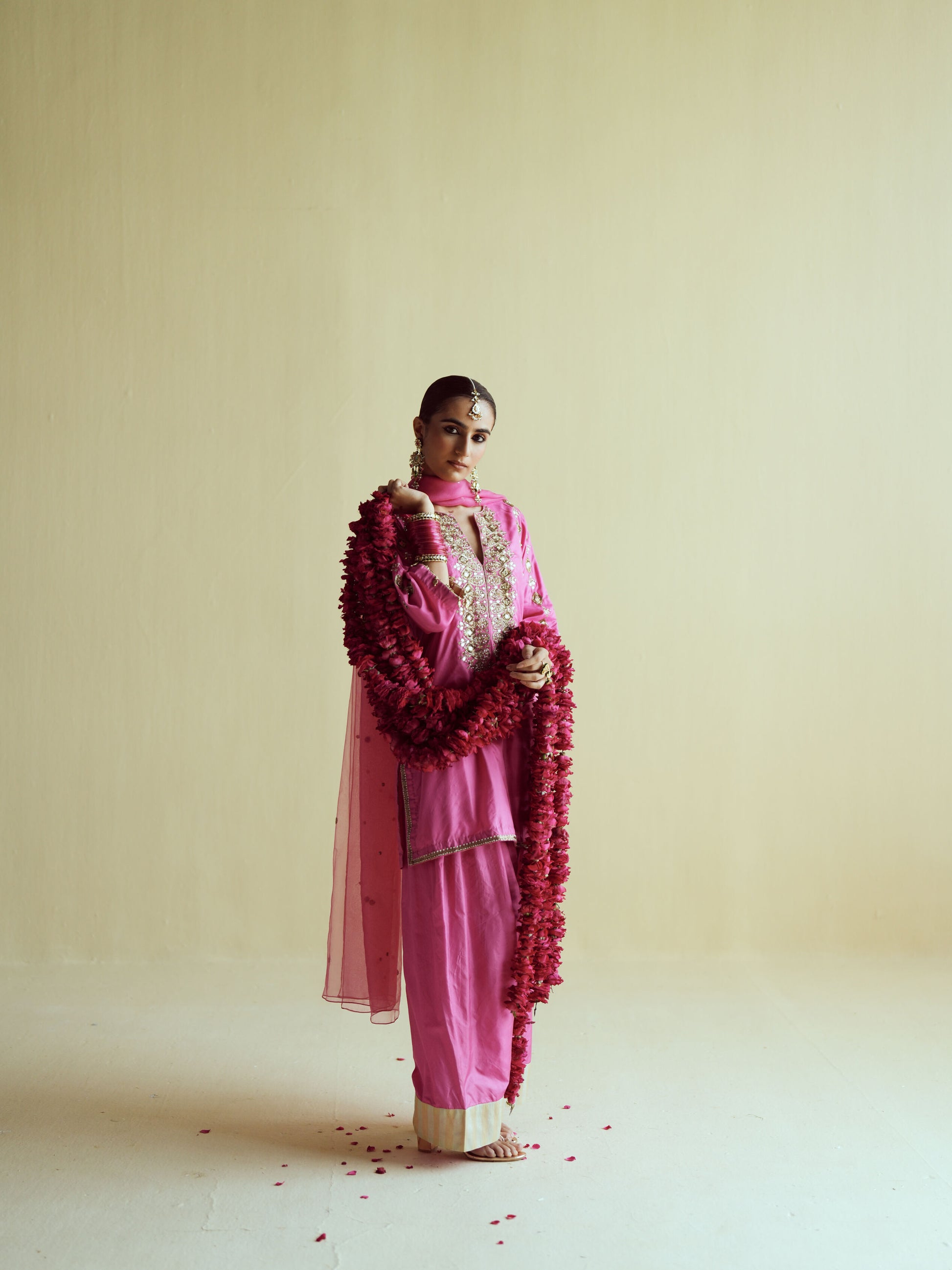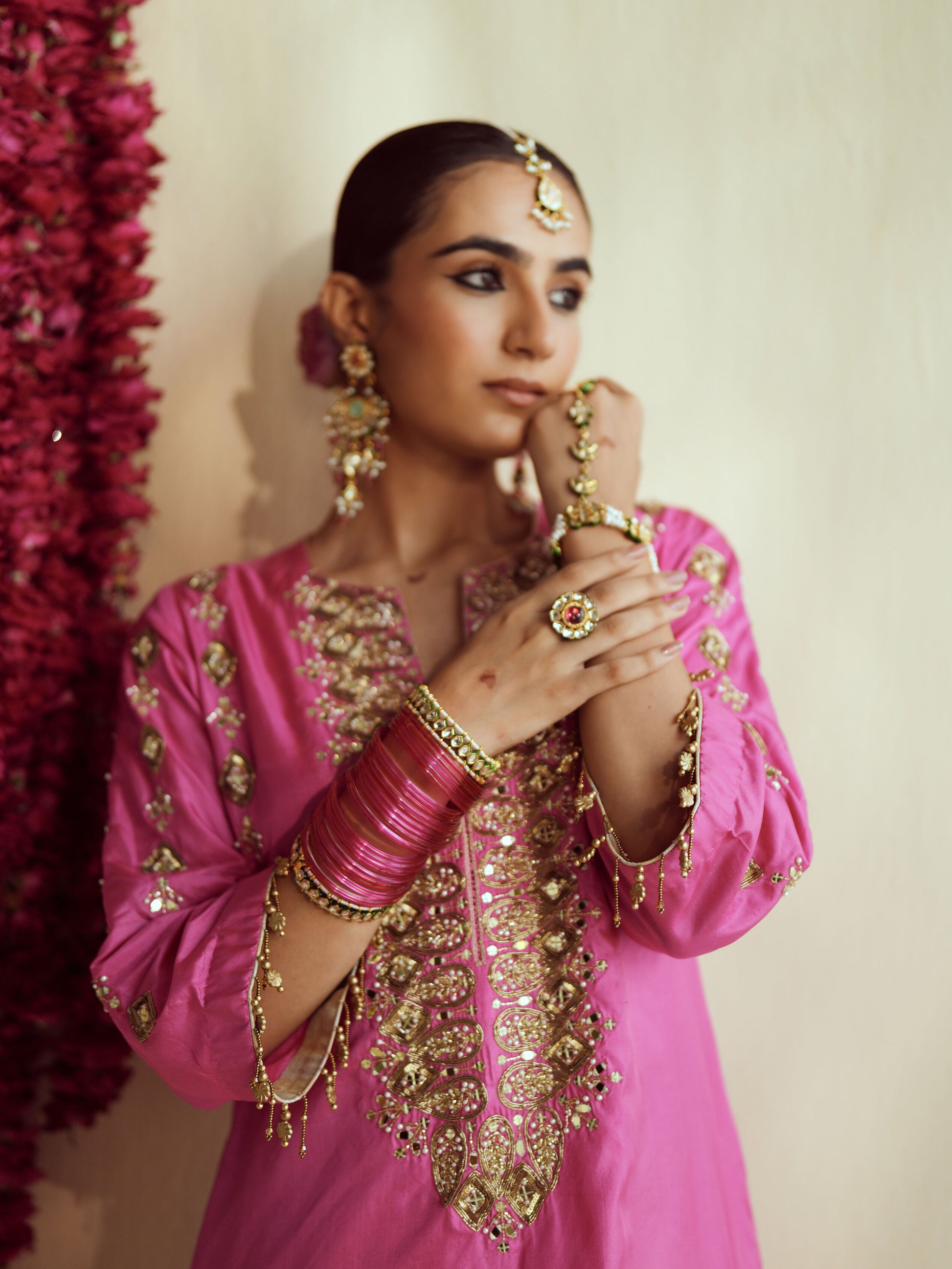 A radiant hot pink kurta adorned with intricate golden embroidery and paired with a sheer Organza dupatta and trendy Frashi salwar bringing a vibrant charm to festive gatherings.