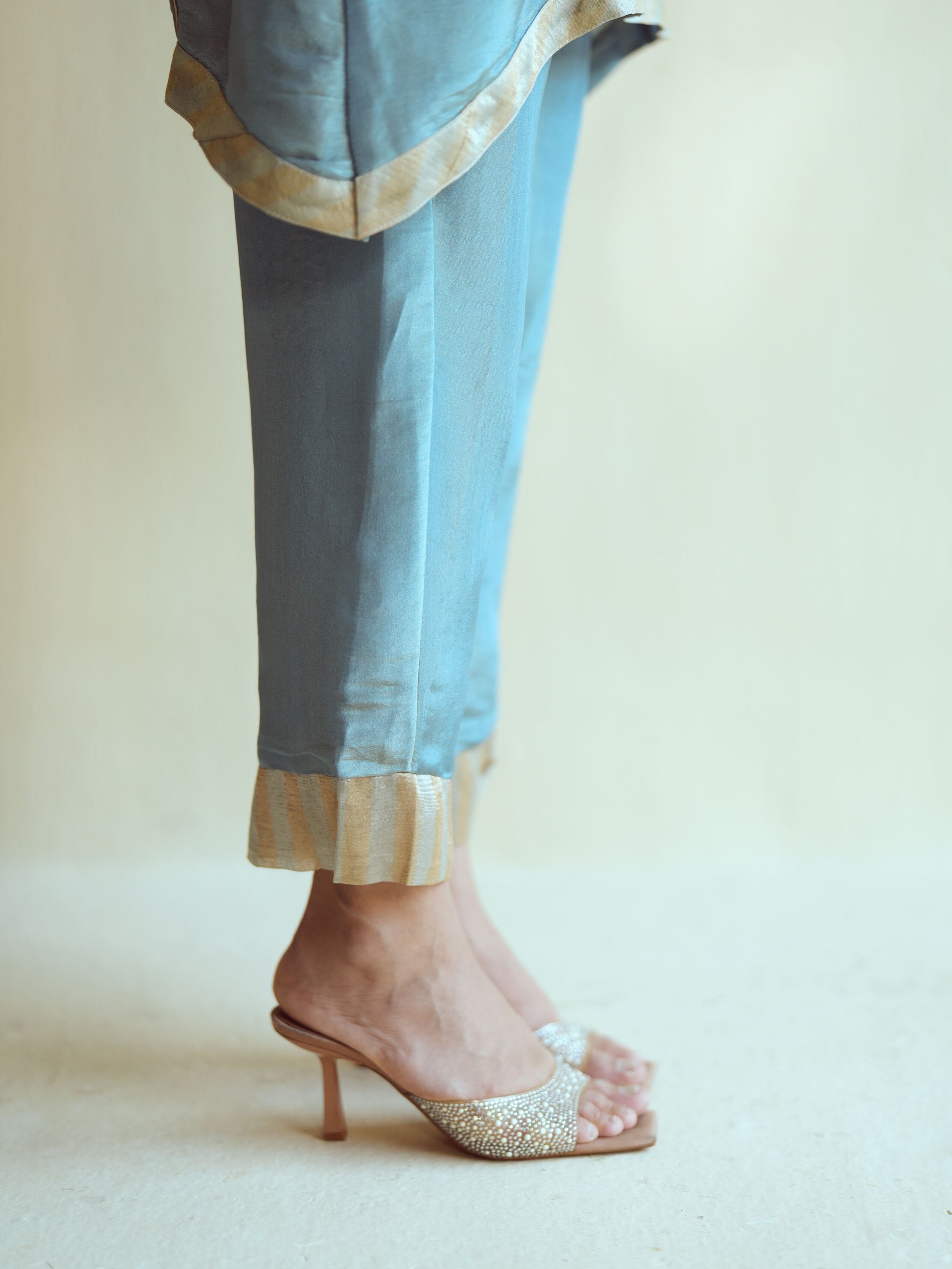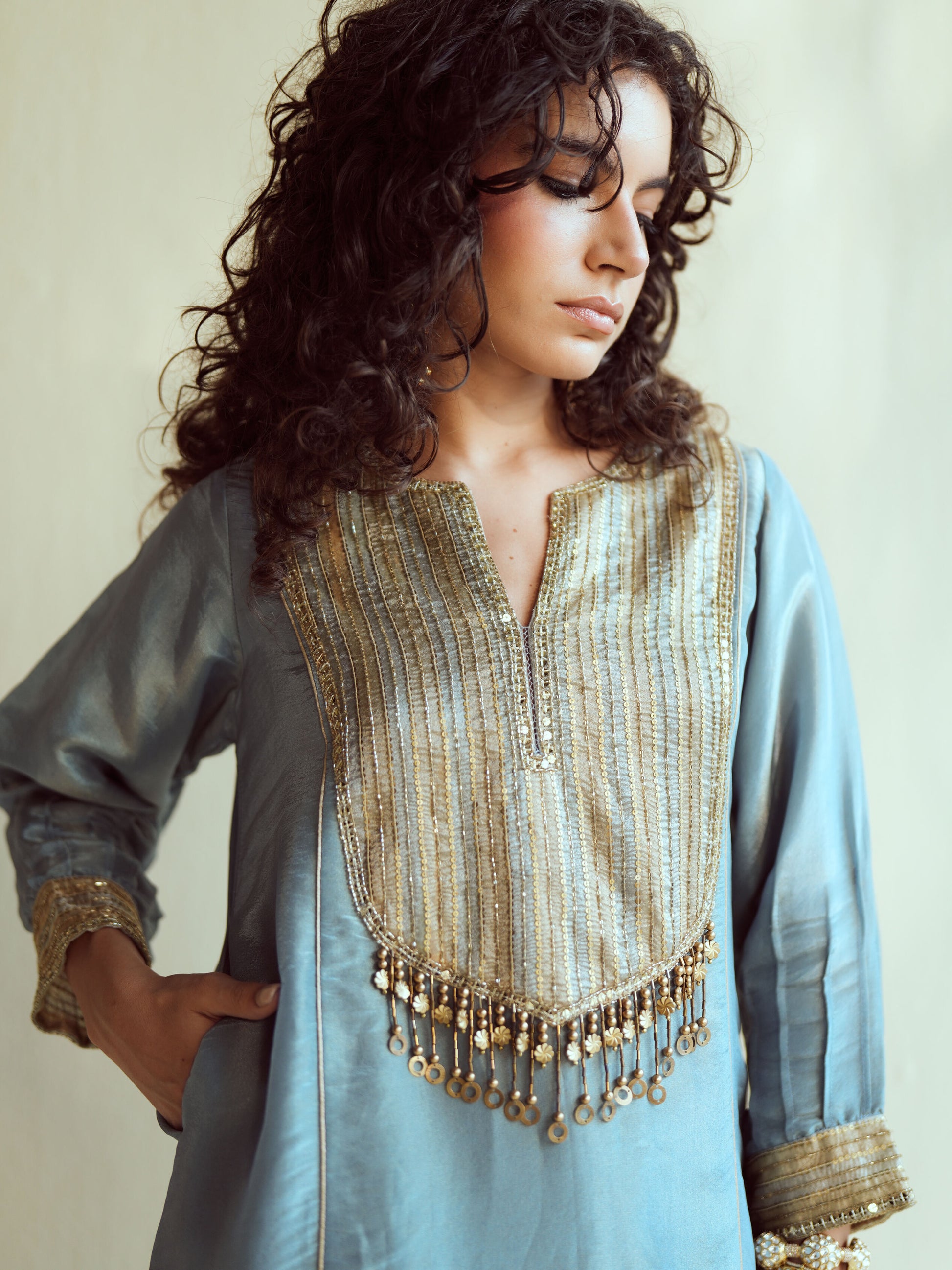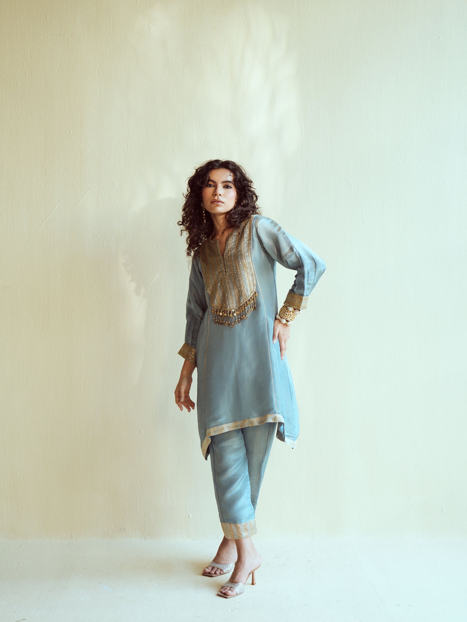 An ethereal tissue kurta set in a unique pale dusty blue, featuring hand-embroidered zardozi and detailing in soft antique gold. The relaxed silhouette in A-line, subtle side slits, and matching slit pants lend this look a festive yet wearable elegance.