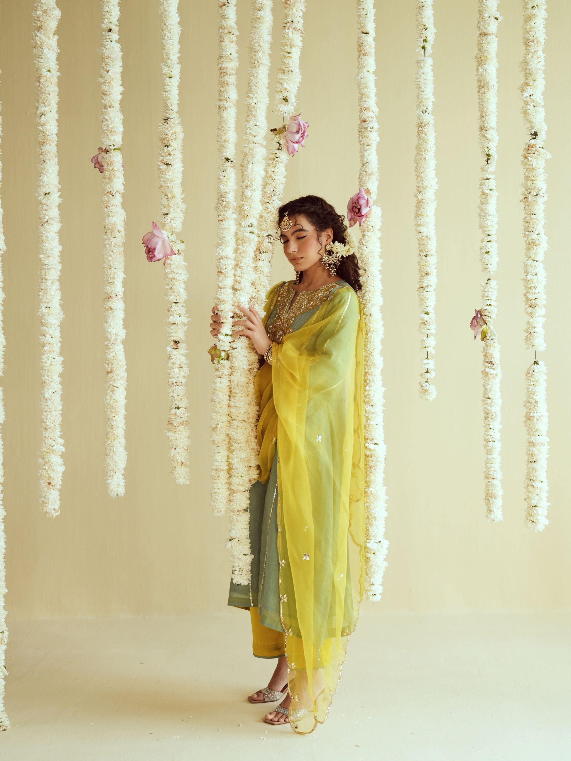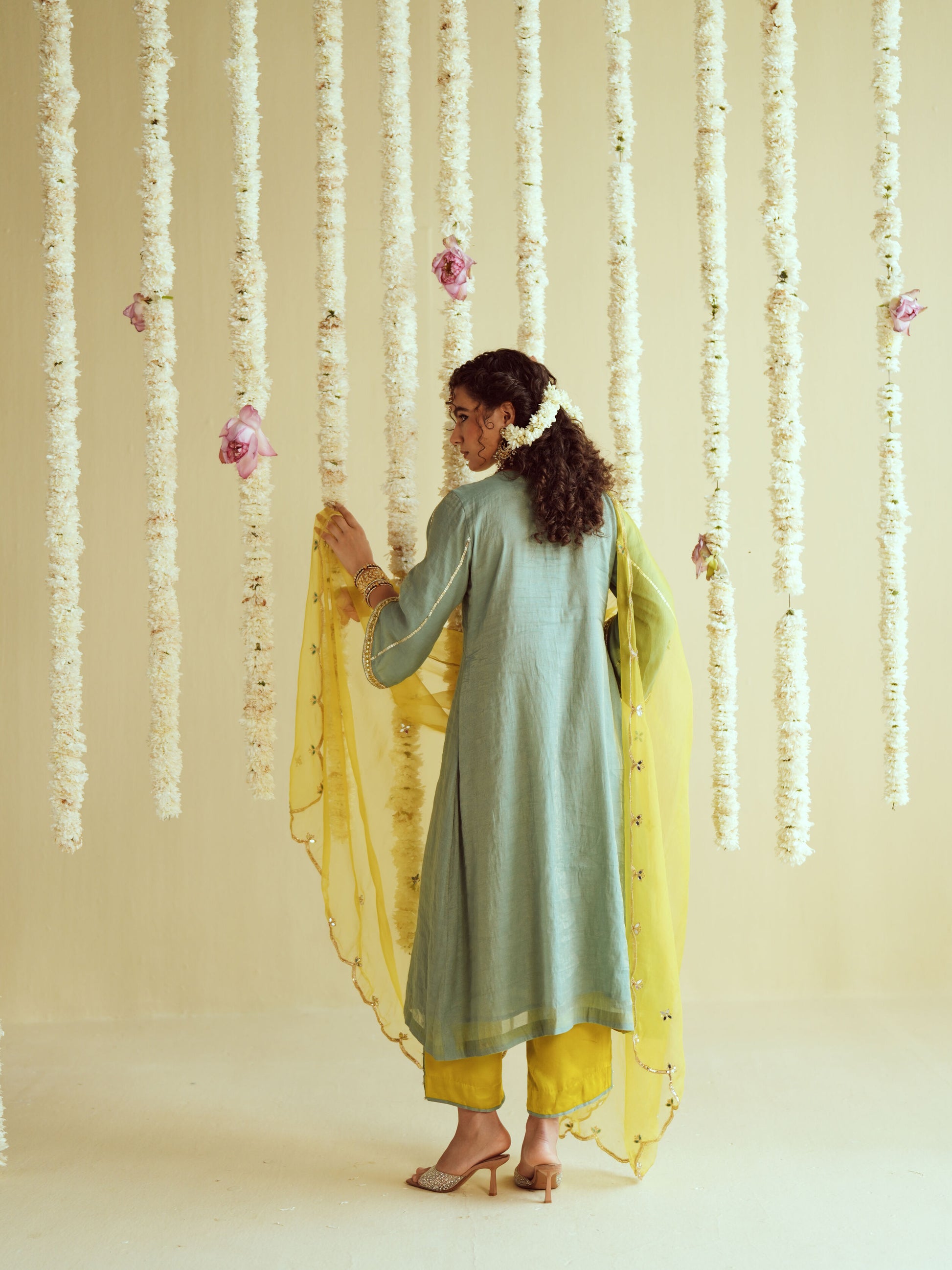 A refreshing mint aqua kurta with golden embroidery yoke, paired with a bright yellow dupatta for a festive touch.