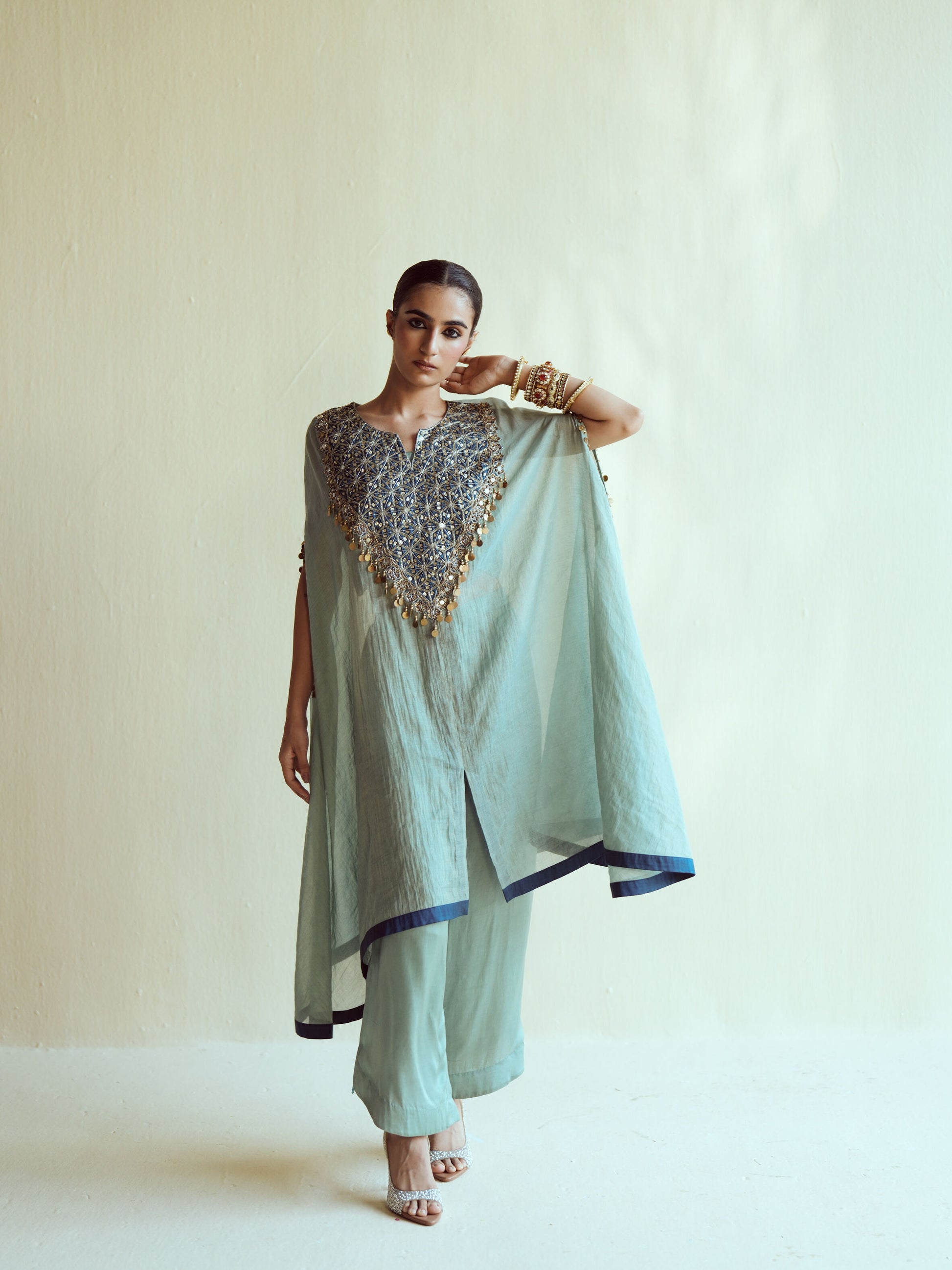 A contemporary mint cape kurta with an embellished navy yoke, finished with metallic tassels for a chic festive flair.