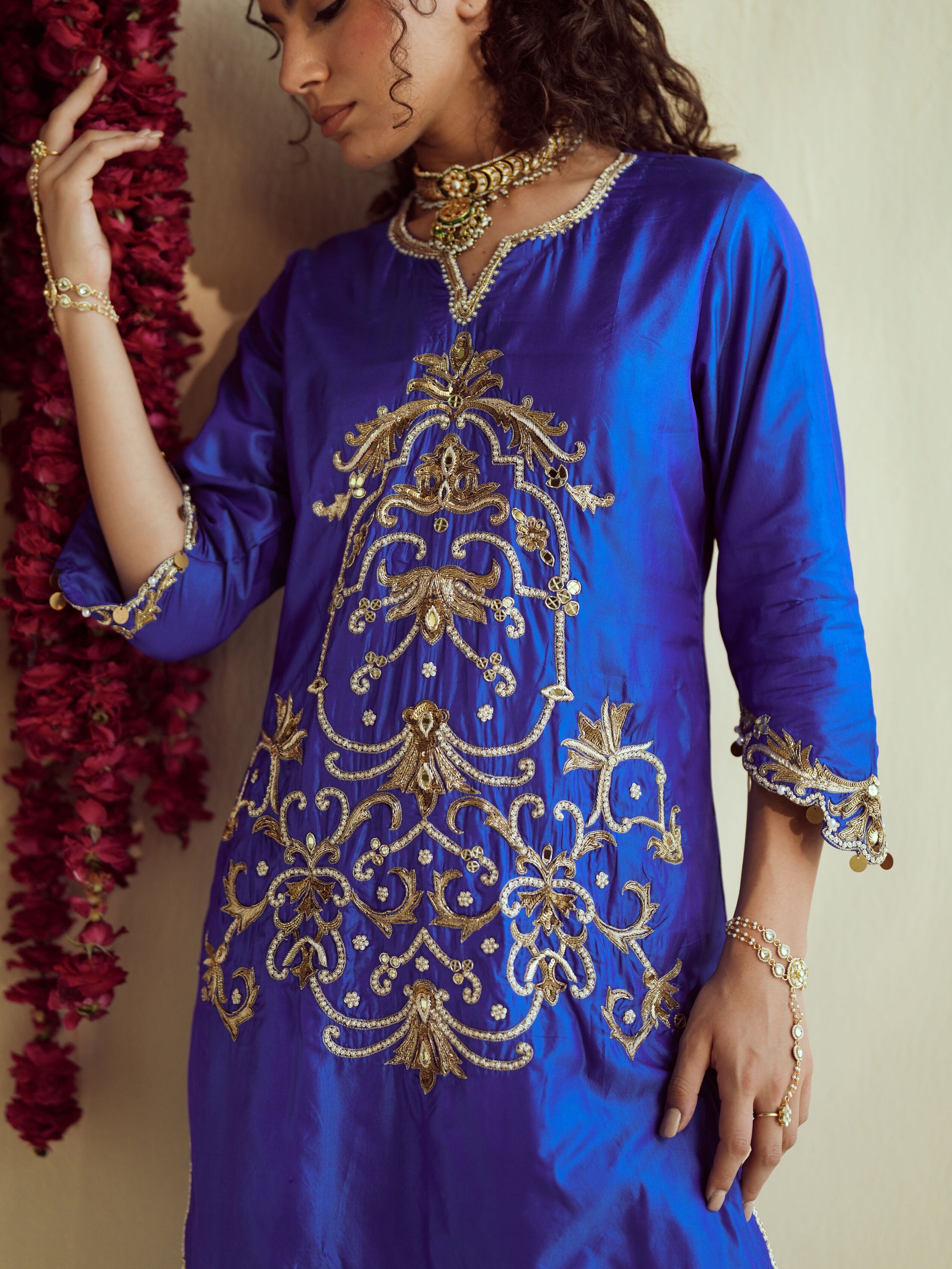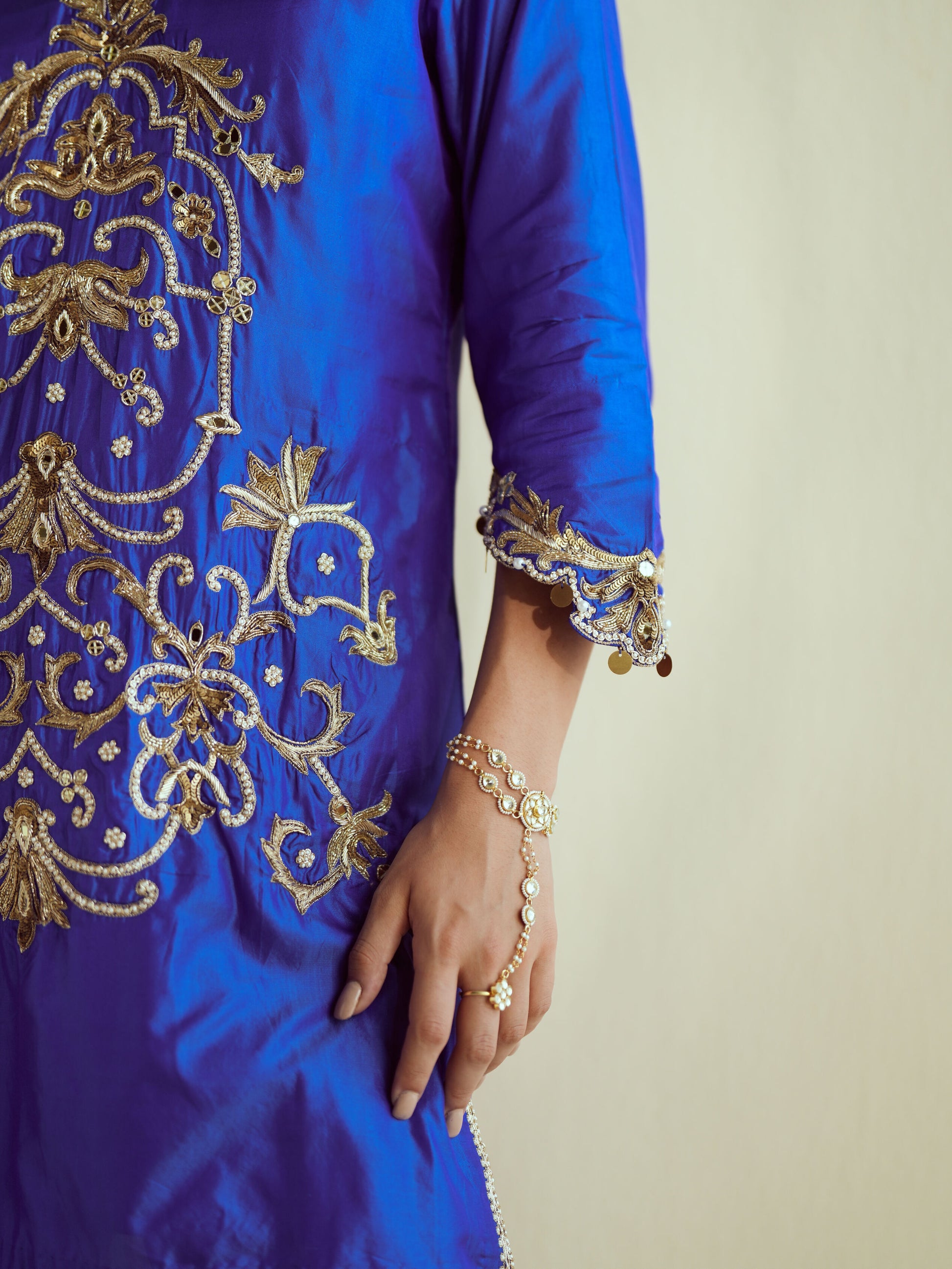 This royal blue ensemble with ornate golden Zardosi work is a regal statement, perfect for evening festivities and celebrations.