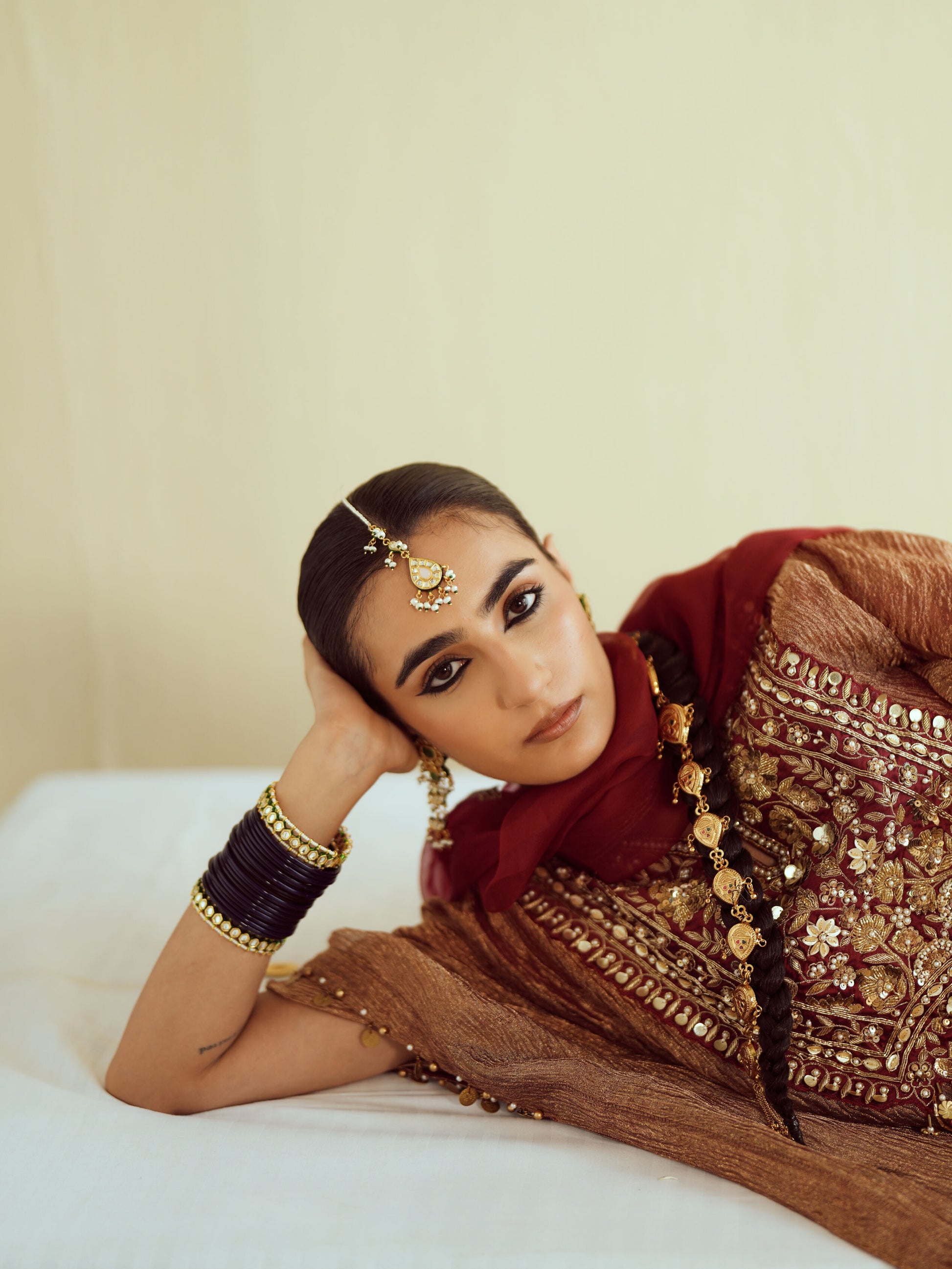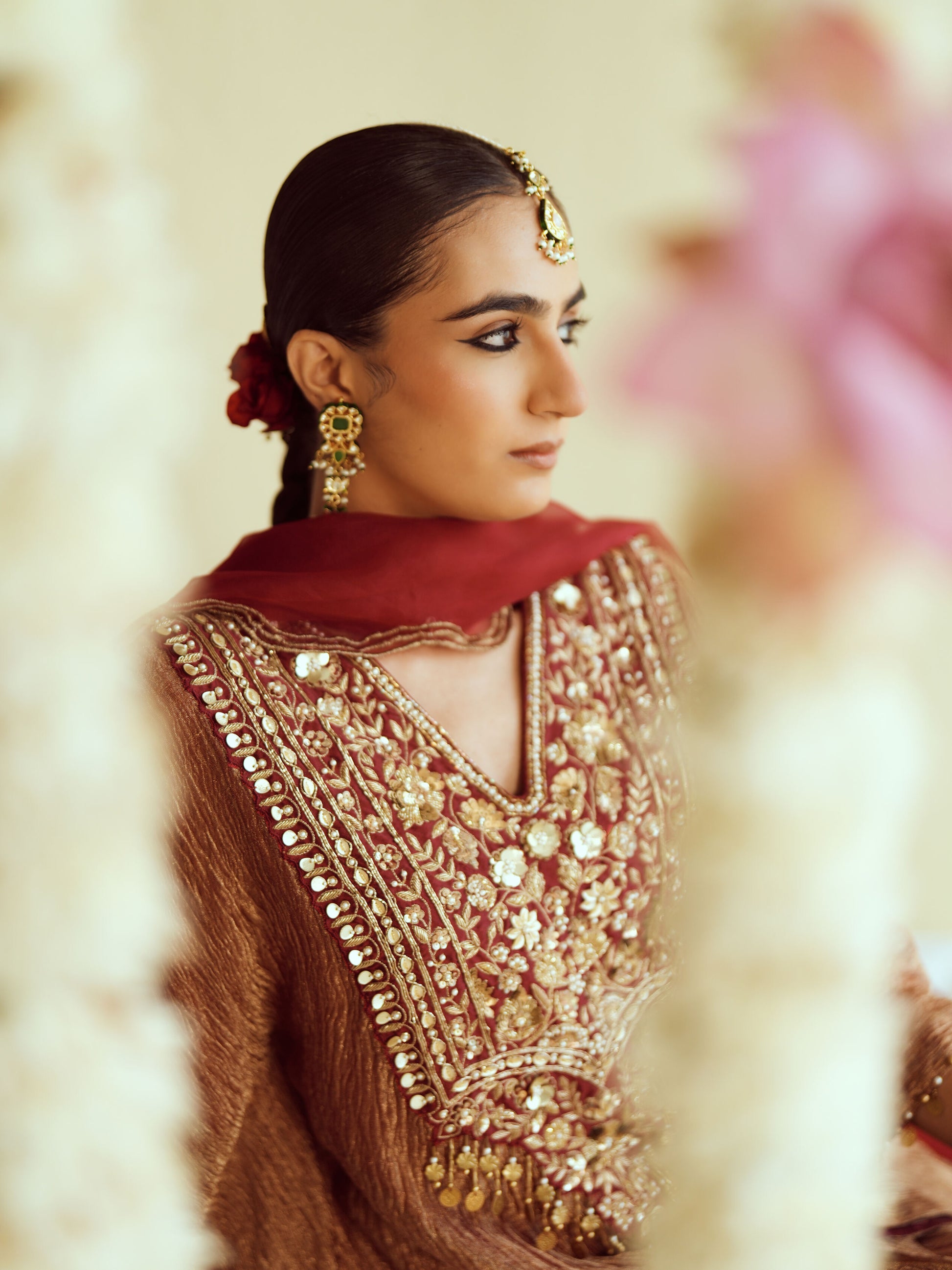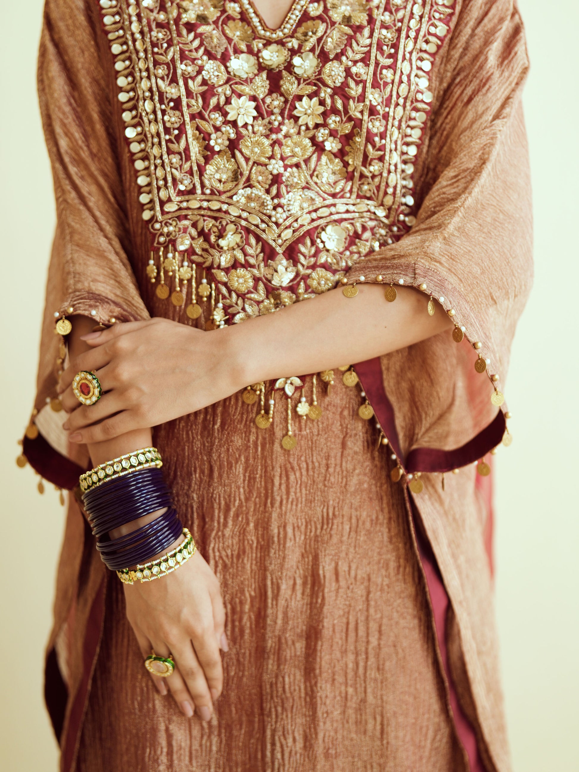 A timeless maroon kurta adorned with vertical gold embellishments and tassel detail, perfect for elegant festive evenings. This look is paired with an afghani salwar and sheer organza dupatta.