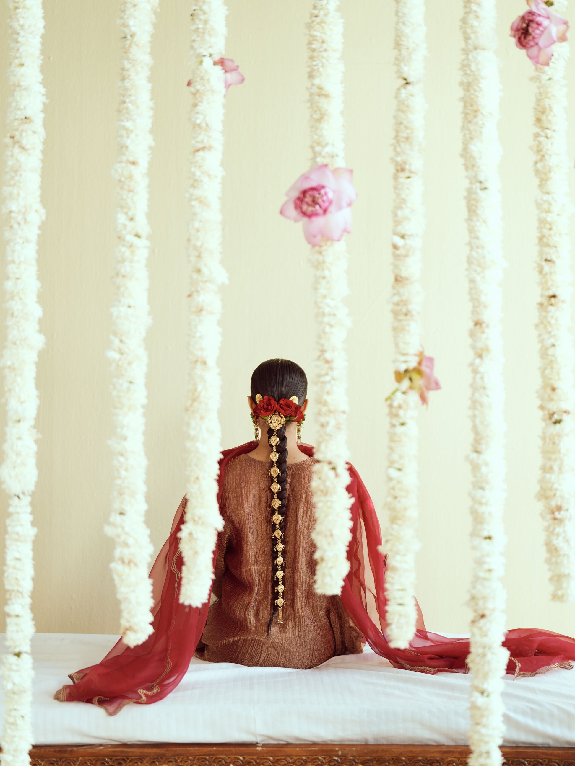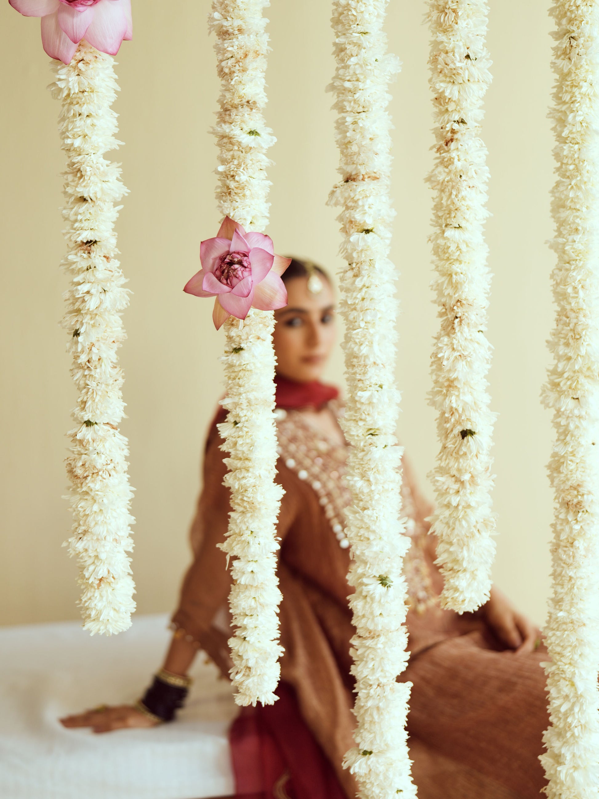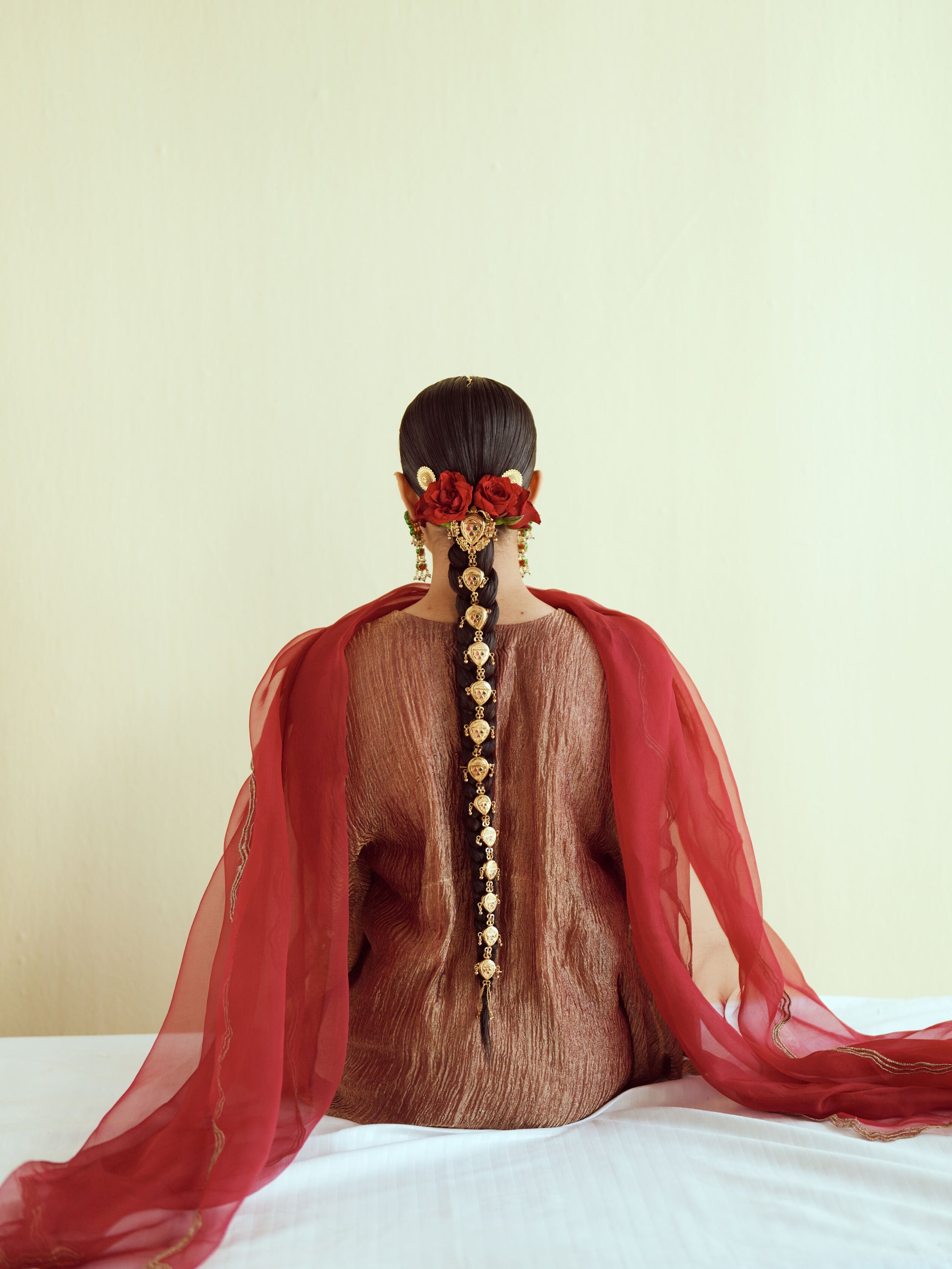 A timeless maroon kurta adorned with vertical gold embellishments and tassel detail, perfect for elegant festive evenings. This look is paired with an afghani salwar and sheer organza dupatta.